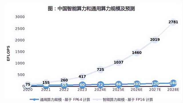 未來80%的場景都將基于人工智能,所占據(jù)的算力資源由智算中心提供[1]。預測顯示,2023-2028年,中國通用算力和智能算力的五年年復合增長率將分別達到18.8%、46.2%。