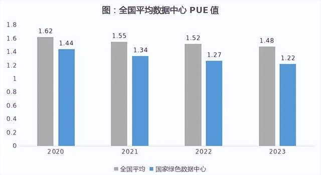 在國家大力推動綠色數(shù)據(jù)中心建設的背景下,我國數(shù)據(jù)中心的平均電能利用效率呈現(xiàn)逐步提升的趨勢。PUE(電能利用效率,Power Usage Efficiency)是用來衡量數(shù)據(jù)中心用能效率的關鍵指標,代表數(shù)據(jù)中心消耗的所有能源與IT設備消耗的能源之比,PUE=1最為理想,意味著所有能耗都用于服務器設備運轉,無其他能耗開銷。近幾年,全國數(shù)據(jù)中心的PUE值呈下降趨勢,國家綠色數(shù)據(jù)中心的評級PUE值已降至1.22,有效發(fā)揮標桿引領作用。