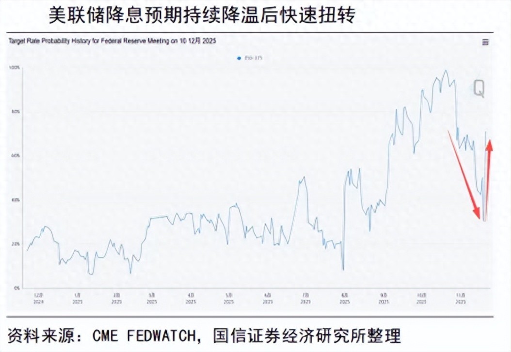 但隨后紐約聯(lián)儲主席威廉姆斯等人旋即釋放“鴿派”言論,表示仍有進一步降息的空間。截至11月23日,CME對降息的押注出現(xiàn)扭轉,12月降息概率重回70%+。